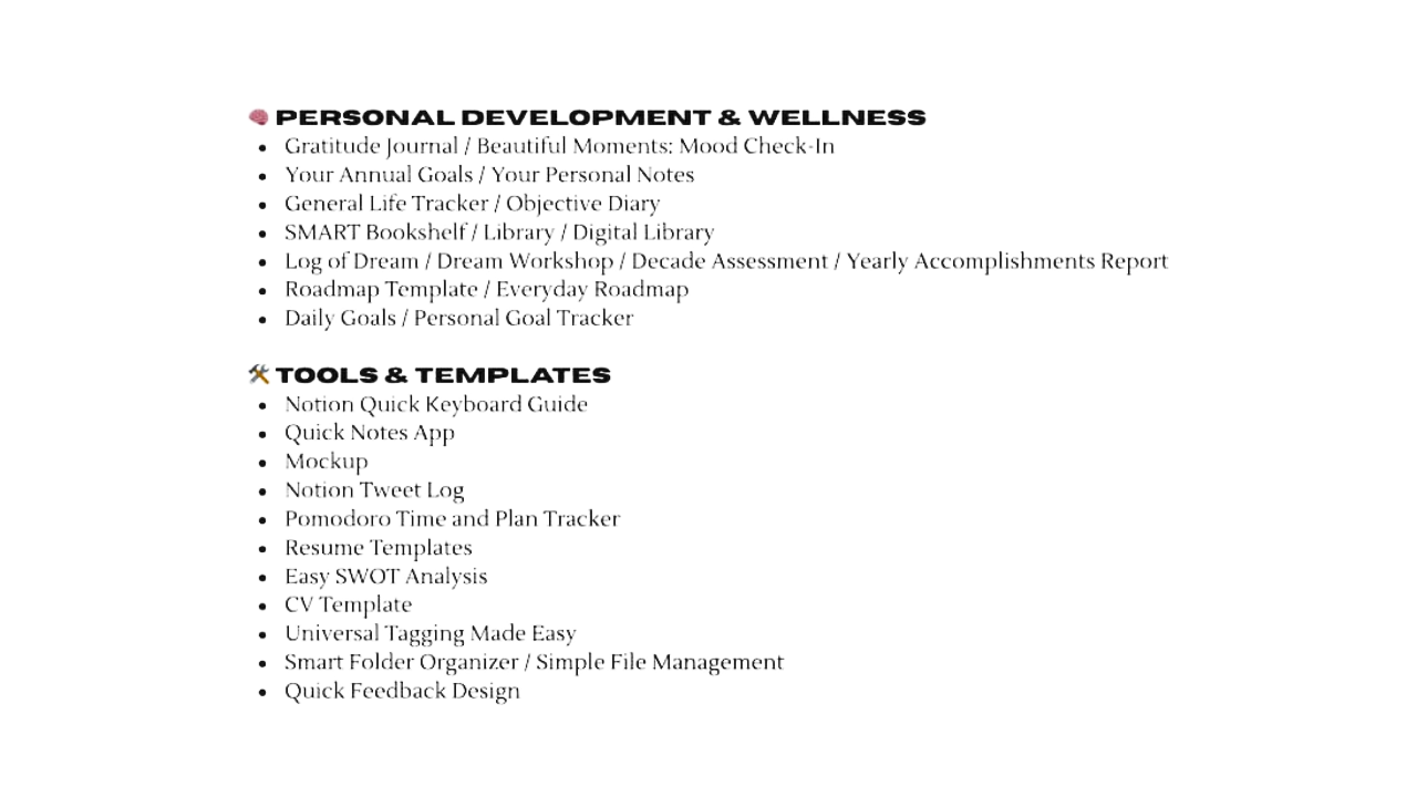 🧩 What’s Inside This bundle includes a diverse range of templates suitable for various needs: Task & Time Management: Organize daily tasks and manage time efficiently. Goal Tracking: Set and monitor personal and professional goals. Content Planning: Plan and schedule content creation and publication. Budgeting: Track expenses and manage finances. Study Scheduling: Organize study sessions and assignments. Idea Organization: Capture and structure ideas effectively